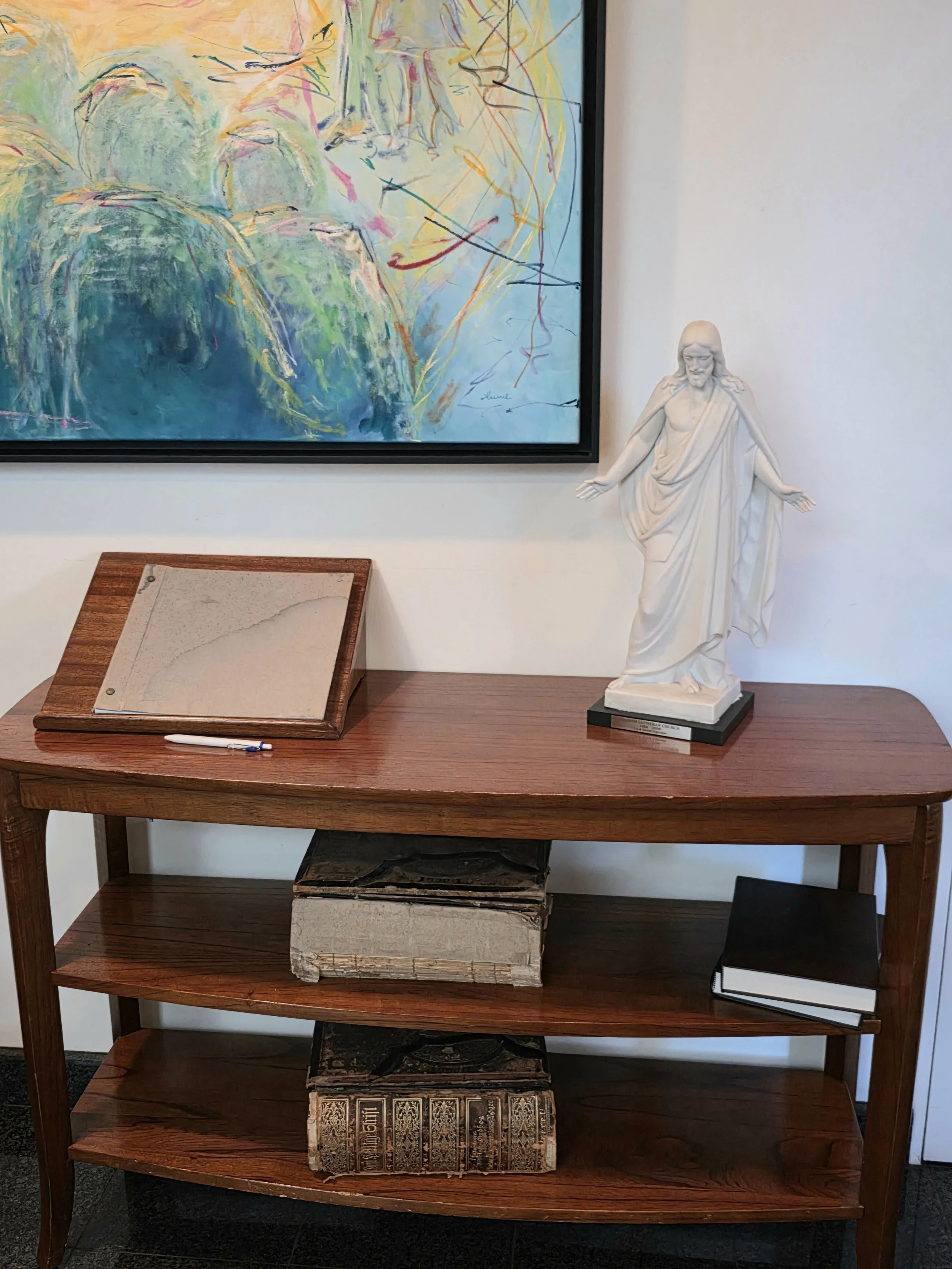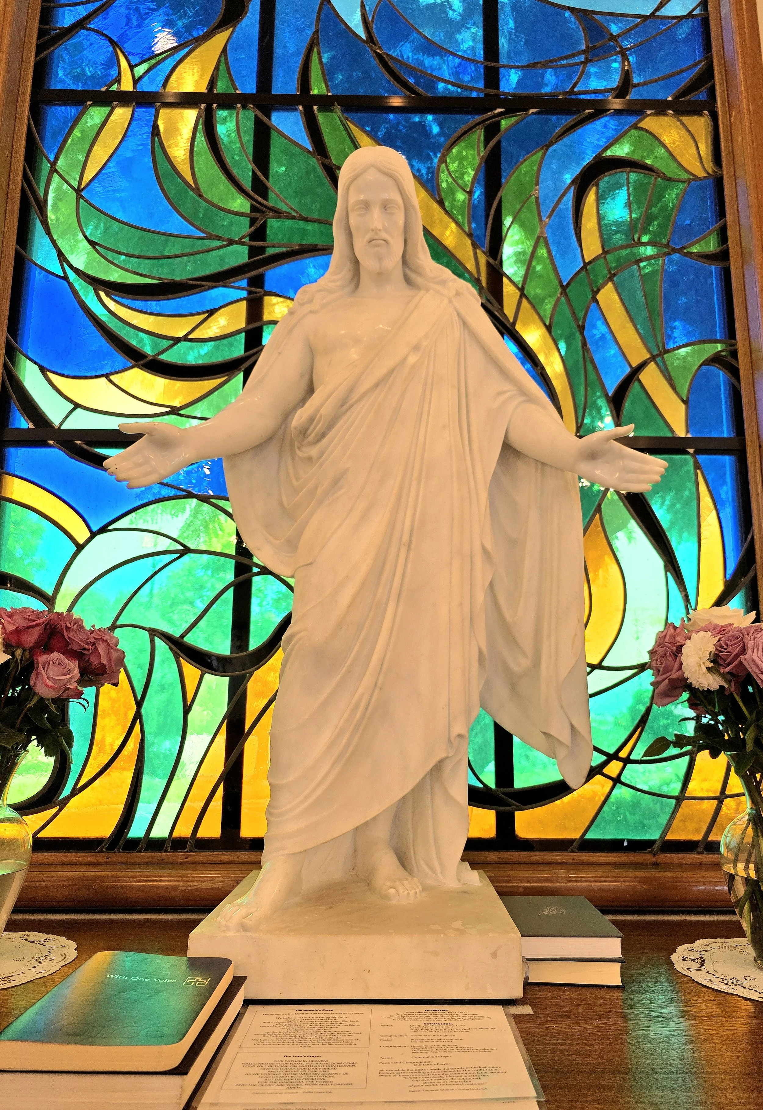 The smaller Christ statue is a handmade, matte glazed porcelain reproduction by the Spanish Lladro company. It rests in the entry to the church welcoming worshippers and guests as they enter.