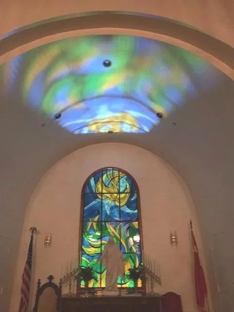 The sanctuary features two distinct stained glass windows with modern, fluid lines and semi-abstract form designed by artist Mitsuki Kondo and installed in 1996. The windows were a gift from Gudrun and Jens Edvardsen.