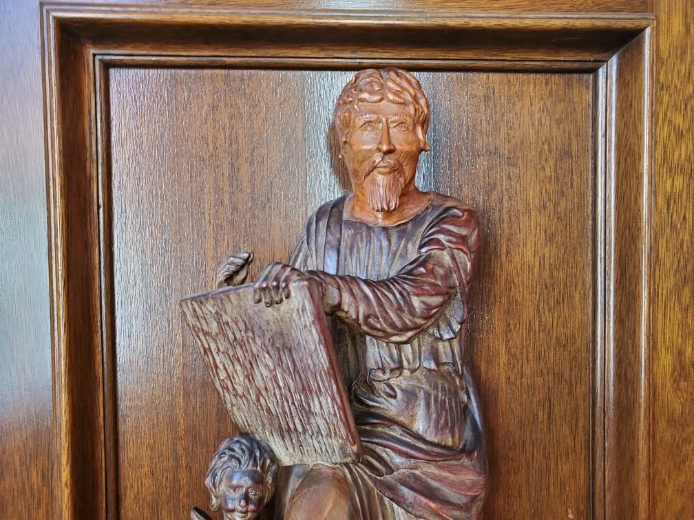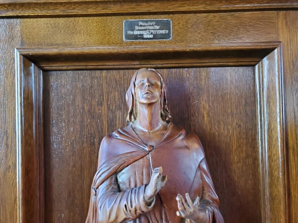 The wood pulpit was made in the United States in the 1930s destined for a church in Denmark but was never shipped. It was purchased for the second Danish Church on 4260 3rd Ave, Los Angeles (3rd Ave. and 42nd street) for $800, prior to its inauguration in 1937. The wood statues were carved by Fred Clark in 1938-39.