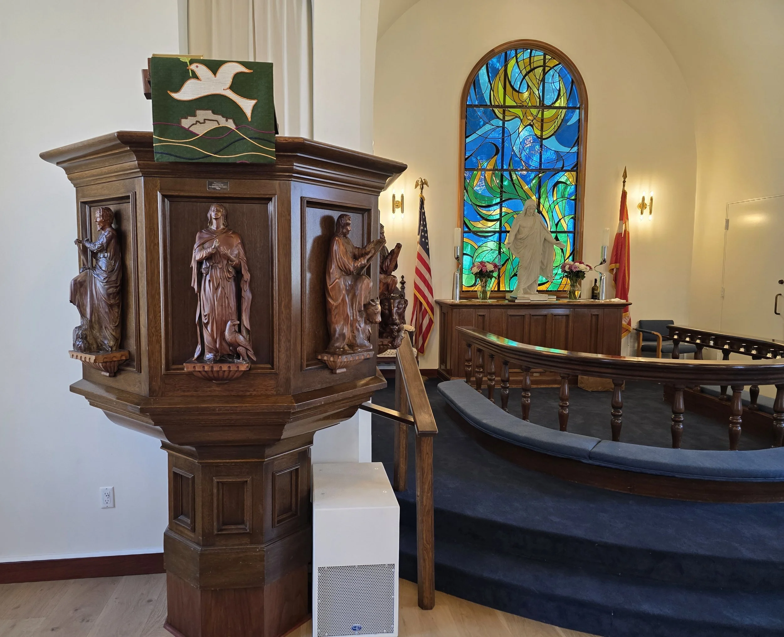 The window above the altar depicts the Holy Spirit in the form of a dove descending into tongues of yellow and orange hued flames on a green field.